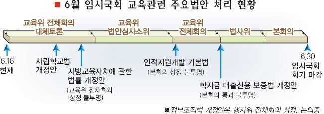 교육인적자원부가 6월 임시국회 내내 속앓이를 하고 있다. 회기가 보름도 남지 않았지만 시급한 주요 법안들이 교육위원회에서 막혀 진전될 기미조차 보이지 않고 있어서다. 국회 교육위에 상정돼 있는 교육 관련 법안은 사립학교법 개정안과 인적자원개발기본법, 지방교육자치에 관한 법률(지방교육자치법) 개정안, 학술진흥 및 학자금대출 신용보증 등에 관한 법률(학자금대출신용보증법) 개정안 등 굵직한 것만 4개다.이들 법안이 ‘제자리걸음’을 하고 있는 것은 법안에 대해 여야간 의견차가 뚜렷한 것도 있지만 교육위에서 충분히 통과될 만한 법안조차 뭉뚱그려 외면당하고 있기 때문이다.