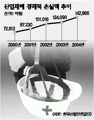 산업현장 안전망에 구멍이 뚫려 있다. 지난 10년간 산업재해 손실액이 86조원에 이르는 등 경제적 비용이 엄청나다. 이같은 손실액은 해마다 증가추세를 보이고 있어 기업 경쟁력을 약화시키는 요인으로 작용하고 있다. 때문에 산업현장에 ‘안전 원칙’이 지켜지는 풍토 조성이 무엇보다 시급하다. 안전에 빨간불이 켜진 산업현장의 상황과 이에 따른 정부의 대책 등을 알아본다.●지난해 손실액 인천공항 2개 건설비용