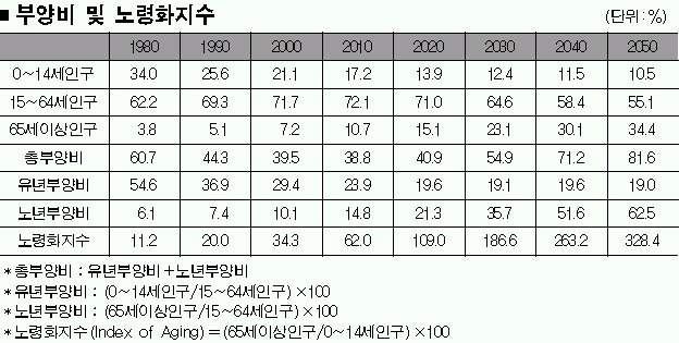 주어진 자료를 개략적으로 살펴 보면,1980년 이후 10년 단위로 2050년까지의 인구변화예측과 그에 따른 부양비 및 노령화지수를 제시하고 있다. 유년(0∼14세)인구의 비중은 감소하는 반면 노령(65세이상)인구의 비중은 증가하고 있으며, 청장년(15∼64세)인구 비중은 2010년까지 증가하다가 2020년 이후 감소가 예상되고 있다.