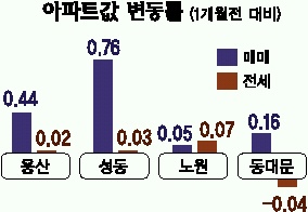중구·종로구는 매매가 0.47%, 전세가 0.46% 올라 지난달보다 상승폭이 커졌다. 신당동 남산타운 아파트 32평형이 2000만원 정도 올랐다. 용산구는 매매가가 0.44% 올랐지만 상승폭이 둔화됐다. 전세가는 큰 변동 없다. 마포·서대문·은평구는 매매가가 0.59%, 전세가는 0.10% 올랐다. 성동·광진구는 매매가 0.76% 올랐고 전세가는 큰 움직임 없다. 노원·도봉구 매매가는 0.05%, 전세가는 0.07% 상승했다. 창동역 부근이 민자역사 개발 기대로 다소 강세다. 성북·강북구는 매매가가 0.26%, 전세가는 0.18% 올랐다. 동대문·용산구 매매가는 0.16% 올랐지만 전세가는 0.04% 내렸다.