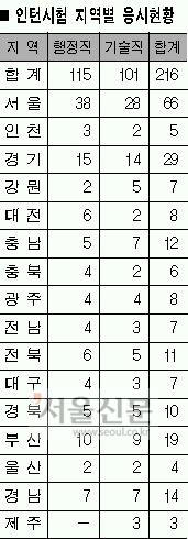 17일 중앙인사위원회에 따르면, 지난 10일 치러진 지역인턴제 필기시험에 총 216명이 응시한 것으로 집계됐다. 행정직과 기술직 각 25명씩 50명을 선발할 이번 지역인턴제의 경쟁률은 평균 4.32대1인 셈이다.