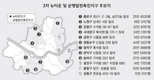 서울시는 29일 각 구청이 접수한 3차 뉴타운 후보 22곳 가운데 9곳,2차 균형발전촉진지구 후보 16곳 가운데 3곳을 균형발전촉진지구로 선정했다고 밝혔다.
