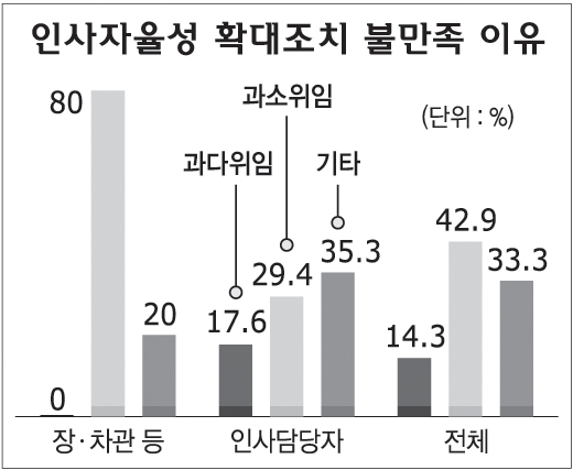 인사자율권 확대에 대한 만족도에서는 대다수인 83%가 만족한다고 답했다.12.6%(17명)는 ‘매우 만족’,70.4%(95명)는 ‘대체로 만족’한다고 응답했다. 반면 ‘불만족’이라는 답변은 16.3%(22명)였다.