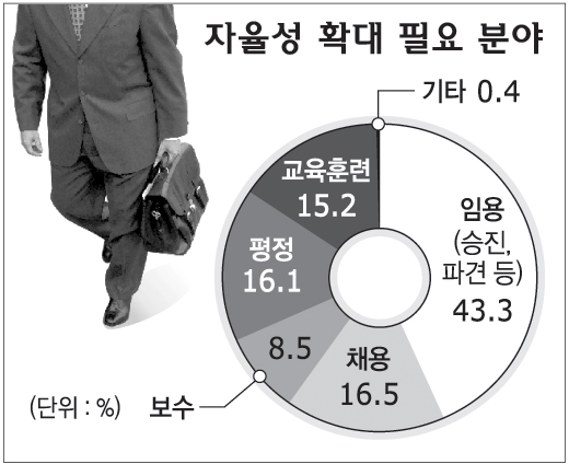 향후 자율권이 확대돼야 할 분야로는 장·차관급 기관장은 임용(47.4%), 평정(15.4%), 교육훈련(15.4%), 채용(12.8%), 보수(9.0%) 등의 순으로 답했다. 반면 인사 담당자들은 임용(41.1%), 채용(18.5%), 평정(16.4%), 교육훈련(15.1%), 보수(8.2%) 순이라고 응답, 기관장과 차이를 보였다.