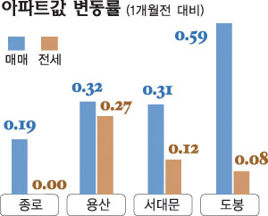 중구·종로구는 매매가격 상승률이 0.19%를 기록했지만 상승폭은 지난달보다 줄어들었다. 전세가는 변동이 없다. 용산구는 매매가격이 0.32% 올랐지만 상승폭은 둔화됐다. 전세가는 0.27% 상승했다. 마포·서대문·은평구는 매매가격이 0.31%, 전세가는 0.12% 올랐다. 도화동 현대1차 56평형이 3000만원 정도 올랐다. 성동·광진구는 매매가가 0.71% 올랐고 전세가도 0.35%로 크게 상승했다. 성수동1가 쌍용 32평형은 1500만원 정도 올랐고, 금호동1가 벽산 32평형은 전세가도 1000만원 정도 올랐다.