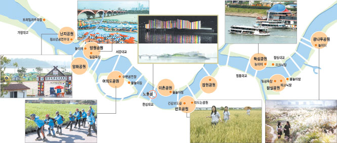 접근성이 좋은 뚝섬·잠실·여의도·난지지구는 ‘광역거점지구’로 개발하는 등 지구별로 특화하고 있다. 시민들이 많이 이용하는 양화·잠원·망원지구는 가족 단위 활동을 유도하는 ‘지역거점지구’로, 이촌지구는 청소년 대상의 시설을 주로 갖추는 ‘청소년이용지구’로, 반포는 ‘전원풍경지구’로 설정해 한강공원별 특성을 드러낼 수 있도록 차별화 작업을 하고 있다.