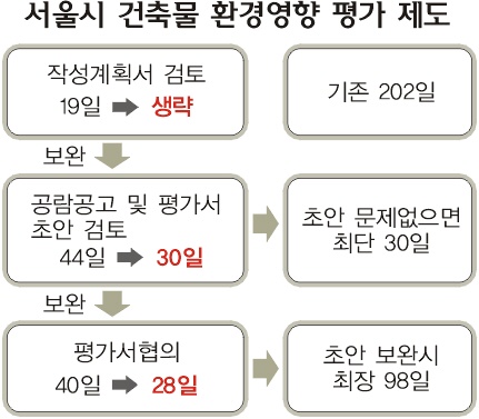 서울시는 21일 “개발사업을 벌이면서 환경훼손을 줄이기 위해 실시하는 환경영향평가의 기간을 현행 202일에서 30∼98일로 단축키로 했다.”면서 “이는 관련조례가 최근 시의회를 통과한 데에 따른 것”이라고 설명했다.