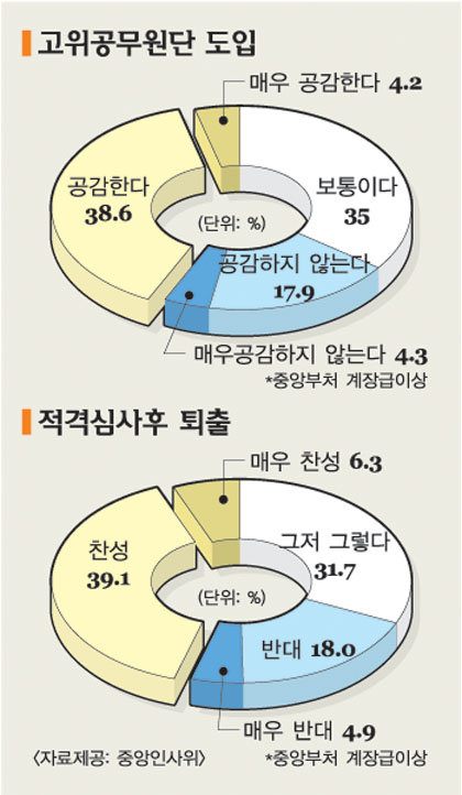 이는 중앙인사위가 51개 중앙행정기관 실·국장, 과장, 계장급 2547명과 민간전문가 104명 등을 대상으로 지난 6월28일부터 7월21일까지 실시한 설문조사 결과다. 설문조사에 따르면 고위공무원단 대상자인 1∼3급들은 절반 이상 ‘찬성’했고 특히 민간전문가들은 80%의 찬성률을 보였다.