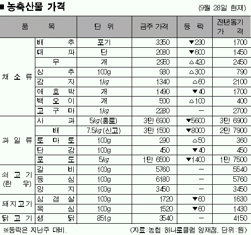 29일 농협 하나로클럽 양재점에 따르면 배추의 경우 고랭지 생산량이 감소한 데다 품질이 좋지 못한 물량이 증가하면서 시세는 지난해 동기 1700원보다 두 배 가까이 비싸다.10월 출하되는 준고랭지 2기작 물량도 충분하지 못해 배추 시세는 당분간 강세를 보일 것으로 전망된다.