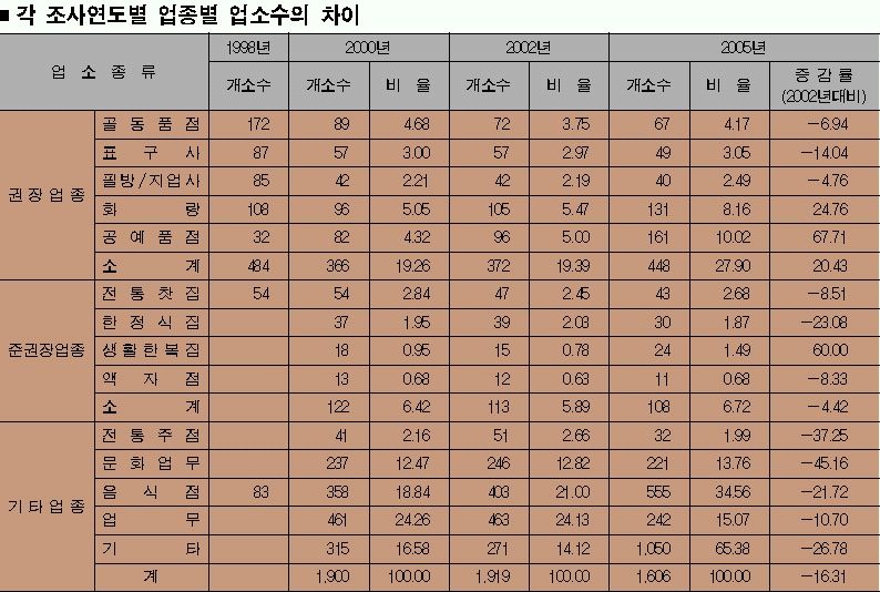 문화지구 지정 이후 거리는 많이 변했다. 전통업소는 상당수 늘었고, 개발압력도 가라앉았다. 그러나 내부적으로 살펴보면 그리 좋은 것만은 아니다. 전통업소 중 상업적인 공예품점이 크게 늘어난 반면, 골동품점과 표구사, 필방 등은 크게 줄어들었다. 인사동의 주인이었던 전통예술이 크게 사라지고, 그 자리에 공예품점이 주인을 차지한 것이다. 오히려 지금은 고서점과 표구점, 필방이 모두 공예품을 팔려고 나서고 있다.