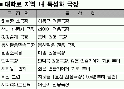 대학로에는 또한 특징적이고 전문적인 극장이 있다. 하늘땅 소극장은 어린이 전용극장이며, 샘터 파랑새 극장은 ‘라이어’를 장기공연하는 극장이다. 한번쯤 들어봤음직한 ‘지하철 1호선’이 공연되고 있는 ‘학전그린’극장, 품바 중심의 ‘강강수월래’ 극장 등 그 전통의 명맥은 대학로를 연극의 1번지, 연극의 갯벌로서 만들고 있다.