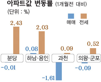 과천은 재건축 아파트가 가격 하락을 주도하면서 1.61%로 내려 하락폭이 컸다. 전세가는 0.09% 상승했다. 부림동 주공 7단지 18평형은 3000만∼4000만원 떨어졌다.