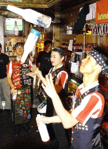 | 한 외식업체가 주최한 ‘바텐더 챔피언 대회’에 참가한 바텐더들이 병돌리기 등 칵테일쇼 기술을 선보이고 있다. 바텐더는 전문서비스직으로 자리매김하며 인기직종으로 성장하고 있다.서울신문 포토라이브러리 |