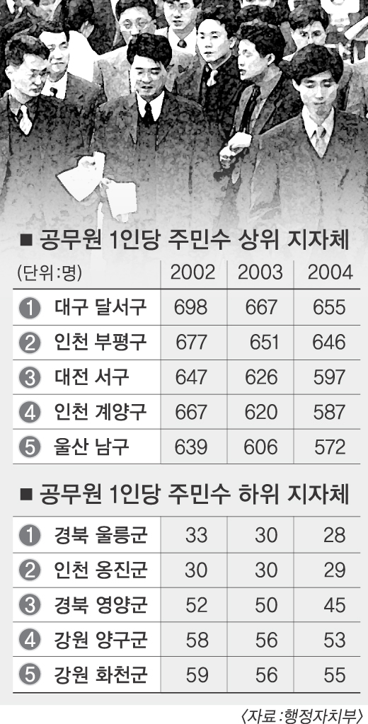 반면 경북 울릉군은 공무원 1인당 28명의 주민만을 맡고 있어 전국에서 가장 낮은 비율을 보였다. 이 같은 비율은 2002년 33명,2003년 30명 등으로 매년 감소추세를 보이고 있다. 울릉군의 인구는 2002년 9615명에서 9245명(2003년),9191명(2004년) 등으로 약간씩 줄고 있는 반면, 공무원은 2002년에 291명에서 310명(2003년),332명(2004년)으로 늘어난 것으로 집계됐다. 이어 같은 섬지역인 인천 옹진군이 29명으로 그 뒤를 이었고, 경북 영양군(45명), 강원 양구군(53명), 강원 화천군(55명) 등의 순이었다.