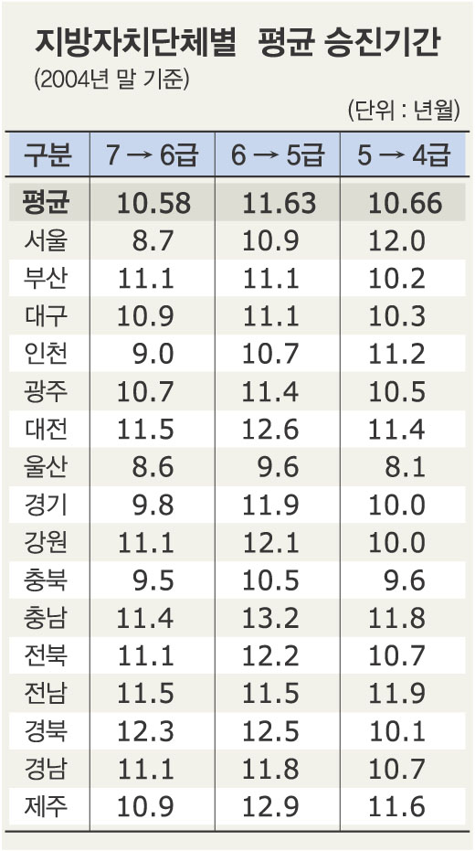 자치단체별 비교에서 6급 승진 때 가장 오래 걸린 곳은 경북으로 12년 3개월이다. 이어 전남과 대전이 11년 5개월이었다. 반면 울산은 8년 6개월로 가장 빨랐고 이어 서울이 8년 7개월 걸렸다.5급 승진 때는 제주가 12년 9개월로 가장 길고, 이어 대전(12년 6개월), 경북(12년 5개월), 전북(12년 2개월) 등의 순이었다. 가장 빠른 곳은 울산으로 9년 6개월이다.4급 승진도 울산이 가장 빠른 반면 서울은 12년으로 가장 길었다.
