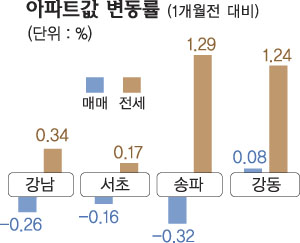 가락동 시영 19평형 매매가는 5000만∼8000만원 내렸고, 잠실동 우성 29평형 전세가는 3000만원 올랐다. 강동구 매매가는 0.08%, 전세가는 1.24% 올랐다.