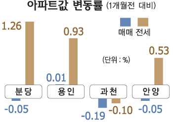분당은 매매가격이 0.05% 빠졌고, 전세가는 1.26% 올랐다. 이매동 삼성 32평형 매매가는 3000만원 내렸고, 정자동 주공 28평형 전세가는 2000만∼3000만원 올랐다. 하남·용인은 매매가격이 0.01%, 전세가는 0.93% 상승했다. 신봉동 LG자이 46평형 시세는 1000만원 안팎 내렸다.