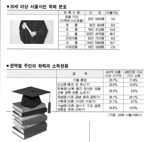 ‘2004 서울서베이’에 따르면 4년제 대졸 이상의 학력을 지닌 가구주 비율은 서초·강남·송파·강동구 등 동남권에서 36.1%로 최고 수준을 나타냈다. 반면 다른 도심권·동북권·서북권·서남권 등에서는 21∼25% 수준을 보였다.