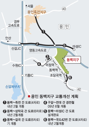 영동고속도로를 이용할 수 있는 동백∼마성IC 연결도로도 설계를 마쳤다. 동백∼42번 국도를 연결하는 4차로 도로도 공사를 마치고 내년 2월 개통 예정이다. 동백∼갈곡 6차로 도로는 개통됐다.