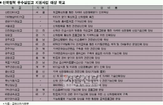 정부는 올해 8월부터 3년 동안 시범사업으로 전국에서 20개 학교를 선정, 매년 2억원씩 연간 40억원을 집중 투자한다. 교육부는 학교별로 개설된 학과 가운데 성장동력산업과 연관된 전공의 사업 계획을 심사해 최종 20개교를 선정했다. 교육부는 시범 사업 결과에 따라 대상 학교를 확대할 계획이다. 특히 농림부나 보건복지부, 문화관광부, 정보통신부 등 산학 협력 프로그램을 운영하고 있는 중앙 부처와 연계, 더 다양한 분야의 실업고도 혜택을 받을 수 있도록 할 방침이다.