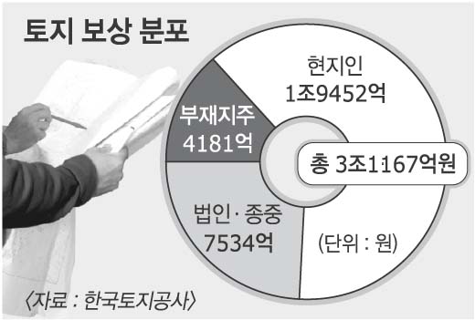 지목별 평균 평당 보상가는 대지가 63만원, 밭이 25만원, 논이 24만원, 임야는 7만원이다. 가장 비싼 보상가는 대지에서 평당 582만 9000원이며, 가장 낮은 보상가는 임야로 평당 2만 4000원짜리가 나왔다.