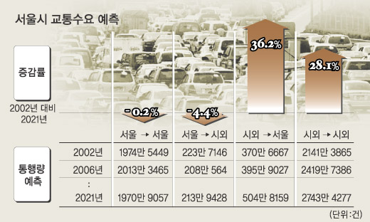 이 보고서에 따르면 경기도·인천시 등 서울시 외곽에서 서울시로 유입되는 하루 평균 차량통행량은 2002년 370만 6667건에서 2021년에는 504만 8159건으로 무려 38.2%가 증가할 것으로 예측됐다. 같은 기간 서울시에서 서울시 외부로 나가는 하루 통행량은 223만 7146건에서 213만 9428건으로 되레 4.4% 감소할 것으로 조사됐다. 이는 수도권의 신도시 건설과 택지개발을 비롯한 주택 건설사업 대부분이 경기지역에 분포, 경기도 인구가 늘어나기 때문이다.