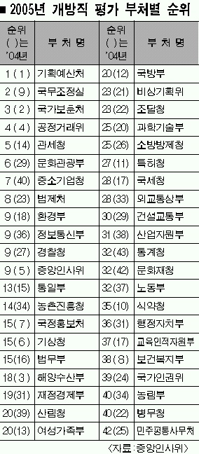 아울러 중앙인사위 종합평가에서 하위권에 속한 부처들은 개방직 공무원 임용에 소극적인 모습을 보인 데다, 선발과정에서도 공정성을 꾀하지 않은 채 내부 공무원 출신들을 우선적으로 임용했다고 중앙인사위는 평가했다.