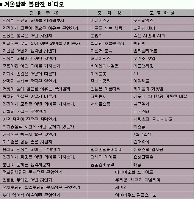 모르면 묻는 것이 상책이다. 검색엔진의 ‘지식사이트’에 ‘이러이러한 주제를 가지고 영화를 보려고 하는데 어떤 영화를 보는 게 좋을까요?’하는 질문을 올려 보라. 고맙게도 하루가 되지 않아서 수많은 답변이 올라온다.