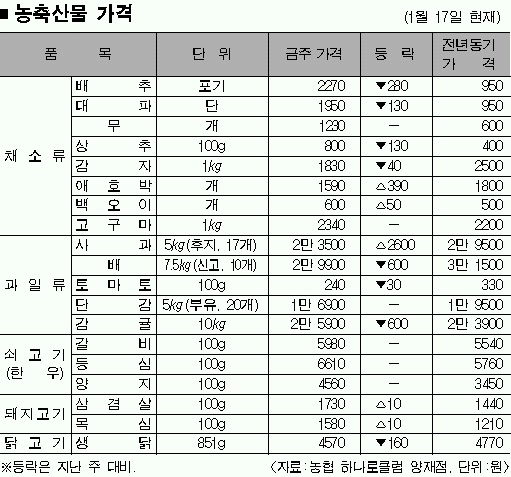 배추와 대파는 값이 조금 내렸지만, 지난해보다는 비싸다. 전주보다 280원·130원 내린 2270원·1950원으로, 지난해보다 두 배 정도 비싼 수준이다.