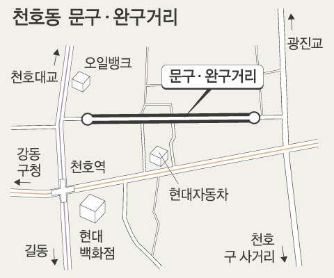 서울 천호동 현대백화점 건너편에는 강동구에서 특화거리로 지정한 ‘문구·완구도매시장’이 있다.100여m에 걸쳐 양쪽으로 문구점과 완구점, 화방, 필방, 체육사, 지물포, 교재사 등 학용품 관련 가게들이 30여곳 몰려 있는 이른바 ‘문구·완구거리’다. 운영시간은 오전 9시부터 오후 7시까지. 일요일과 공휴일은 쉬지만 새 학기 무렵과 어린이날, 크리스마스 등 대목 때는 공휴일이라도 문을 여는 곳이 많다.
