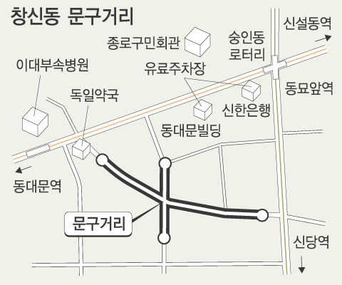 서울 동대문구 창신동 ‘문구거리’도 유명하다. 동대문역 4번 출구로 나와 독일약국 골목으로 들어가면 문구 관련 도매가게 140여곳이 밀집돼 있다. 주로 공책류와 크레파스, 연필, 실내화, 가방, 스케치북 등 학용품을 취급하지만 어린이 선물용품이나 팬시용품, 파티용품 등을 파는 곳도 있다. 오전 8시부터 오후 7시까지 문을 열고, 일요일이나 공휴일은 대부분의 가게가 쉰다. 나들이 삼아 제대로 둘러보려면 3시간은 걸린다.