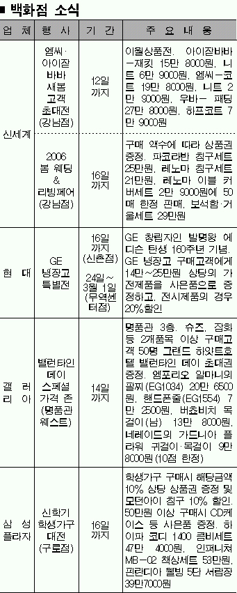대처분 행사는 의류 등을 중심으로 50∼90% 할인하지만 핸드백, 생활용품은 1만원,1000원 균일가 판매도 한다.3,4층 매장에서 3만원 이상 산 고객에게 삼성 애니콜,LG BS 4600, 모토로라 스타텍 2004 등 20만∼30만원대 휴대전화를 무료로 준다. 제품의 질과 가격을 꼼꼼히 따져봐야 한다. 문의 (02)2606-1002. 화곡점이 아웃렛 매장으로 바뀌는 것은 가양동, 김포공항에 대형 쇼핑점들이 들어서 경쟁력을 잃었고, 인근에 대규모 아웃렛 매장이 없다는 점도 작용했다. 화곡점은 몇년 전만 해도 국내 매장 중 최고로 장사가 잘 돼 화제를 모았다. 일부 매장은 인근 발산점에 통합 운영된다.