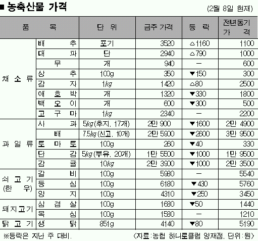 반면 야채 가격은 다시 강세를 보이고 있다. 하나로마트 이준용 채소부문 바이어는 “지난해보다 재배 면적이 감소해 생산량도 줄어들었다.”면서 “배추와 대파는 지난해보다 2∼3배나 비싸다.”고 설명했다.