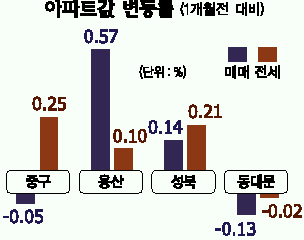 중구·종로구 매매가는 0.05% 빠졌고, 전세가는 0.25% 상승했다. 신당동 현대 48평형 매매가가 1000만원 정도 올랐다. 용산구 매매가는 0.57% 올랐고, 전세가는 0.10% 상승했다. 이촌동 현대 57평형 매매가가 5000만원 정도 뛰었다.