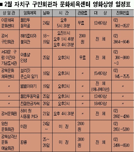 개봉되는 수많은 영화 가운데 자치구의 구민회관이나 문화체육센터는 어떤 기준으로 영화나 연극을 고를까. 또 구민이 예정작과 시간, 장소 등 관련 정보를 빨리 접하는 길은 무엇일까. 동네에서 영화와 연극을 즐기는 방법과 정보를 모았다.