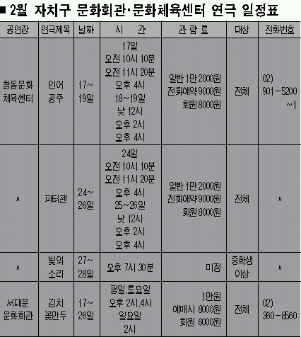영화와 다른 특징은 연말과 연초에 회관에서 많이 연극 공연을 연다는 점이다. 보통 때는 연극은 한 달에 한 차례쯤 하는데 12∼2월엔 한 달에 두 차례 이상 한다. 대학로에 있는 극단들이 관객들이 가장 많이 찾는 이 시기를 놓치지 않고 공연을 많이 하기 때문에 구민회관이나 문화체육센터가 그만큼 고를 영화가 많다는 것이다.