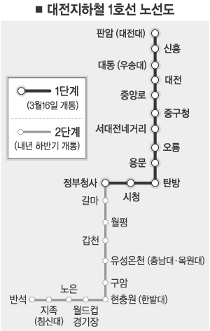 이번에 개통되는 구간은 판암동∼반석역간 1호선 22.6㎞ 가운데 1단계 구간이다. 판암역∼정부청사역간 1단계 구간은 모두 12.4㎞로 21분이 걸린다. 역은 12개가 설치돼 있다.