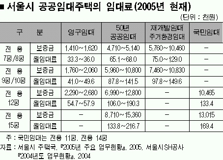 2005년 현재 임대료는 영구임대주택의 경우 보증금 141만원∼268만원과 월임대료 3만 3000원∼5만 8000원 수준이며, 재개발·주거환경임대를 포함한 50년 공공임대주택 및 국민임대주택의 경우 보증금 471만∼1536만원에 월임대료 6만 5000원∼21만 7000원 정도이다.