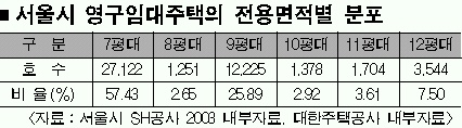 영구임대주택은 전용면적 7∼12평으로 공급되었다. 서울의 경우도 전용면적 7∼9평이 4만 598호(86.0%),10∼12평이 6626호(14.0%)로 초소형 주택 중심으로 공급되었다.‘주택법’에 의한 최저주거기준이 3인 표준가구의 경우 방 2개에 주거면적 8.8평,4인 표준가구의 경우 방 3개에 주거면적 11.2평임을 감안할 때, 매우 작은 규모이다.