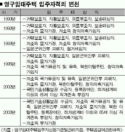현재 영구임대주택 입주대상자는 크게 국민기초생활보장 수급자, 저소득 국가유공자, 저소득 모자·부자가정 등 소득 및 재산기준에 따라 선정된 법정영세민과, 소득 및 재산기준과는 상관없는 등록장애인·청약저축가입자 등이다. 영구임대주택 프로그램 도입 당시만 하더라도 일정 소득 및 재산기준에 미달한 거택보호자, 자활보호자, 의료부조자, 보훈대상자만을 대상으로 하였다. 하지만 정책대상자 중에 주거비의 추가부담문제, 생업문제, 자녀의 교육문제 등으로 영구임대주택에 입주하는 것을 꺼리는 가구가 늘어나자 ‘영구임대주택입주자선정기준및관리지침’의 개정을 통해 1992년에 저소득 청약저축가입자,1993년에 철거세입자도 입주할 수 있도록 하였다. 그리고 ‘주택공급에관한규칙’을 개정하면서 1995년부터 모든 청약저축가입자,2002년부터 등록장애인도 입주가 가능하게 되었다.