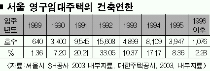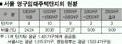현재 서울에는 서울시에서 공급·관리하는 2만 2370호와 중앙정부에서 공급·관리하는 2만 4854호를 합쳐 총 4만 7224호의 영구임대주택이 있다. 영구임대주택 4채 중에 1채가 서울에 있는 셈이다. 하지만 서울에 거주하고 있는 법정영세민이 10만 5900가구이고, 영구임대주택에 거주가구 중에 약 50%만이 법정영세민임을 감안할 때 영구임대주택의 재고는 매우 부족한 상태라고 할 수 있다.