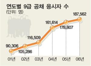 올해 9급 공무원 공채는 19개 직렬 2900명을 선발한다. 응시생은 모두 18만 7562명. 지난 2001년 9만 306명보다 두 배 이상 늘었다. 경쟁률도 64.7대1에 이른다.