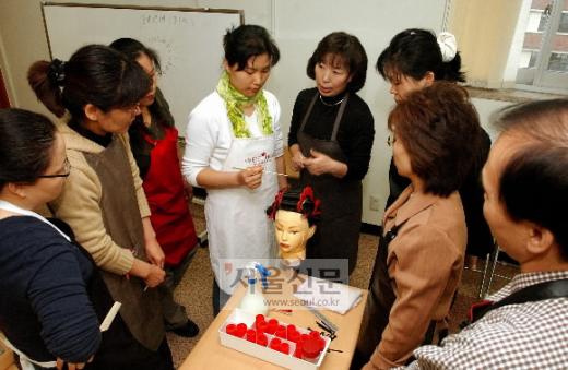 지난달 29일 서울 은평구 불광3동주민자치센터는 ‘미용실’을 방불케 했다. 수강생 박현숙(35)씨는 가발의 머리카락을 몇가닥씩 롤에 감아 힘을 줬다.