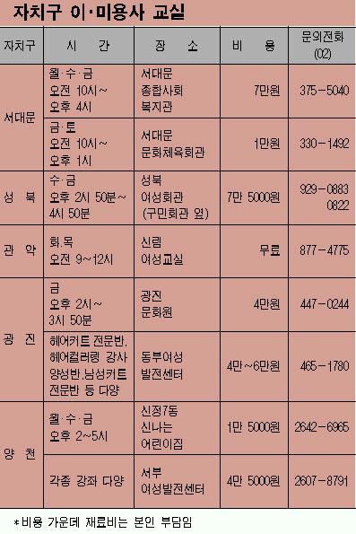 3개월 기초반을 기준으로 시중 미용학원의 경우 90만원 이상은 들지만, 이곳에서는 절반에도 못미친다. 가발·미용도구 등 재료비 40만원은 시중 학원이나 자치센터나 비슷하지만 수강료에서 차이가 난다.