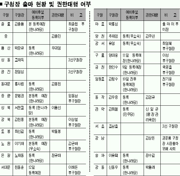 또 영등포·구로·서대문·금천구 등은 1∼2주 사이에 예비등록을 할 예정이다. 이외에 종로·중랑·강북·노원구 등은 예비등록 절차 없이 본등록을 할 예정이다. 따라서 서초·성동·광진구 등 3선 구청장이 버티는 3곳과 출마여부가 미정인 마포구 등을 제외한 21개 구청(강남구, 중구 포함)이 권행대행 체제로 운영된다.