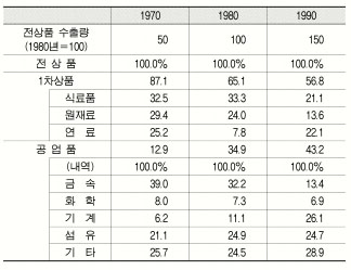 (1)1970년의 전상품의 수출량이 1980년의 1/2이므로 25.2는 12.6의 의미를 지닌다. 따라서 반 이하라고 할 수 없다.