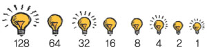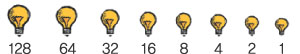 그렇다면, 이진수가 과연 어떤 수인지 쉬운 예를 통해서 알아봅시다. 밝기가 1에서 128까지 2배씩 높아지는 8개의 전구를 가지고 있다고 생각해 봅시다. 각각의 전구들에는 스위치가 있습니다.