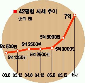 최근에는 강북 U턴 프로젝트의 거점으로 용산이 주목받으면서 가격은 대폭 오르고 있다.42평형의 경우 2003년부터 지난해말까지 5억원대 초반에서 후반으로 조금씩 올랐을 뿐이지만 올 들어 급등,6월 현재 호가가 7억원을 형성하고 있다.