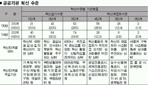 참여정부의 강력한 혁신 드라이브에도 불구하고 공공기관들 가운데 60%가 아직도 혁신 수준이 초기단계인 것으로 평가됐다. 기획예산처는 공공기관혁신평가단(단장 성극제 경희대 교수)이 제출한 210개 공공기관의 지난해 혁신에 대한 평가결과에서 이렇게 나타났다고 4일 발표했다.