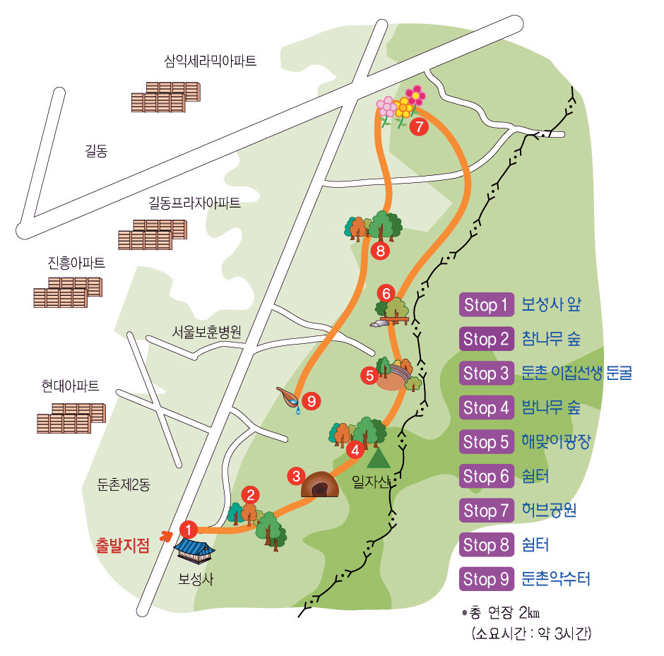탐방은 서울보훈병원 뒤편에 있는 보성사에서 출발해 참나무와 밤나무림, 둔촌동(遁村洞)이라는 이름을 낳게 한 둔촌 이집 선생의 둔굴을 만날 수있다.8월부터는 ‘허브공원’(7월말 준공)도 관람할 수 있다.